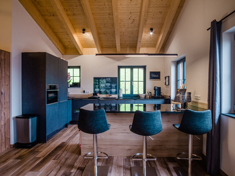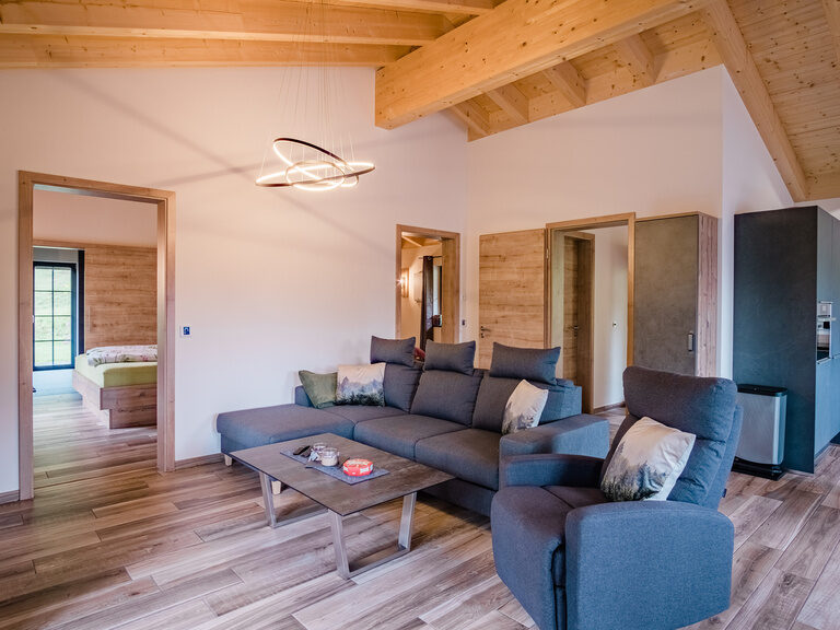 Der angrenzende Wohnbereich mit offener Küche wird gemeinsam für das Beisammensein genutzt. Im Wohnzimmer befindet sich ein Ausziehsofa, wodurch das Chalet Platz für bis zu 6 Personen bietet. Für noch mehr Luxus befindet sich angrenzend an das Chalet eine eigene Sauna sowie ein großzügiger Terrassenbereich.
